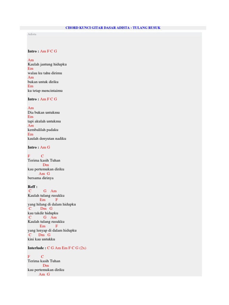 C G Am Em F G C G Am Tiba saatnya kita kan berpisah F Em G Aku akan pergi C G Am. Lagu ini dirilis pada 2018 melalui kanal YouTube Musik Proaktif. Lirik Lagu dan Chord Kunci Gitar Tulang Rusuk - Adista.
