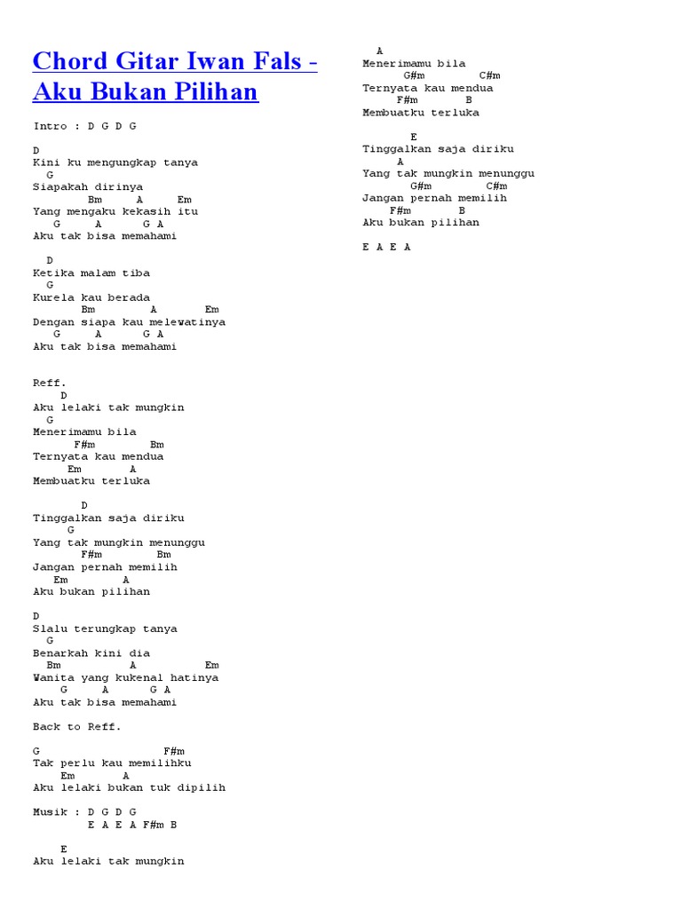 A Fm 4x ASuFmdah cukup AjaFmuh APeFmrjalanan iAniFm DLewati dCmuka lewati Bmtawa ELewatDi segala ApersoaFmlan A Fm AKuFmcoba berkaAcaFm APaFmda jejak yang AadFma DTernyataCm aku sudah tBmertinggal EBahkaDn jauh tertiAngFmgal A Fm ABodohFmnya dirikAu Fm ATaFmk percaya paAdaFmmu DLalu sempCmat aku. Chord Iwan Fals Nona - Intro. G C G C.