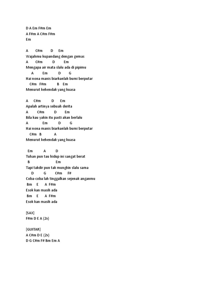 Hai nona manis biarkanlah bumi berputar Em A G F Menurut kehendak yang kuasa C Em F G Apa1ah artinya sebuah derita C Em F G Bila kau yakin itu pasti akan berlalu C Gm-F F Dm Hai nona manis biarkanlah bumi berputar Em-D Dm C C Menurut kehendak yang Kuasa. Utha Likumahuwa - Esok Kan Masih Ada Intro D A Em Fm Em A Fm A Cm Fm Em A Cm D Em Wajahmu kupandang dengan gemas A Cm D Em Mengapa air mata slalu ada di pipimu A Em D G Hai nona manis biarkanlah bumi berputar Cm Fm B Em Menurut kehendak yang kuasa A Cm D Em Apalah artinya sebuah derita A Cm D Em Bila kau yakin itu pasti akan berlalu. G C karnamu tenang.