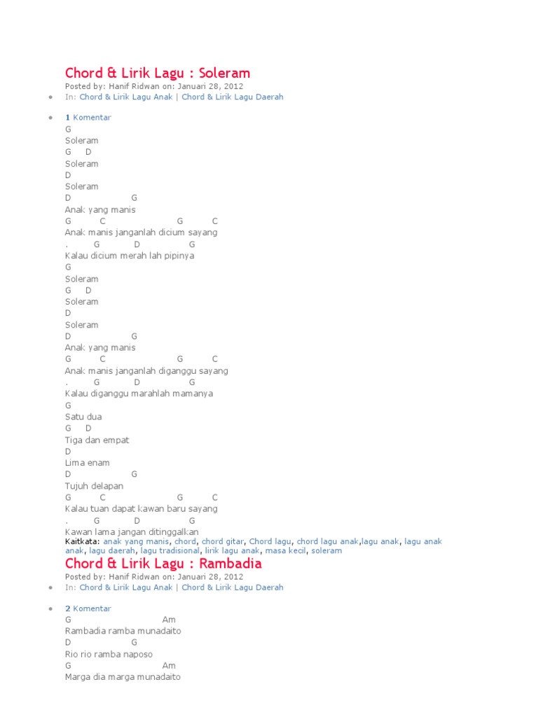 Chord Kunci Gitar Soleram Lagu Anak Afyinfo