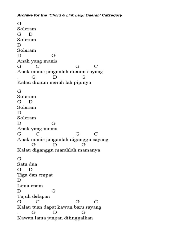 G D G Soleram G D Soleram D Soleram D G Anak yang manis G C G C Anak manis janganlah dicium sayang G D G. Anak manis janganlah diganggu sayang. Anak manis janganlah dicium sayang Am G C.