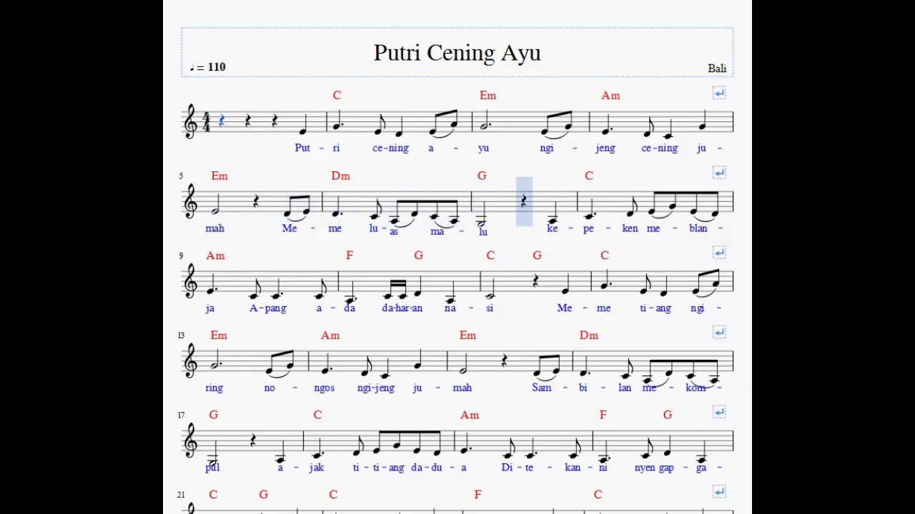 Putri cening ayu Am Ngijeng cening jumah F C Meme luwas malu F C Kepeken meblanja F G C Apang ade darang nasi Melodi. Lagu Cening Putri Ayu 57 MB song and listen to another popular song on Sony Mp3 music video search engine. G C F Dm Em Chords for Made Cenik - Bali Kids Song with song key BPM capo transposer play along with guitar piano ukulele mandolin.